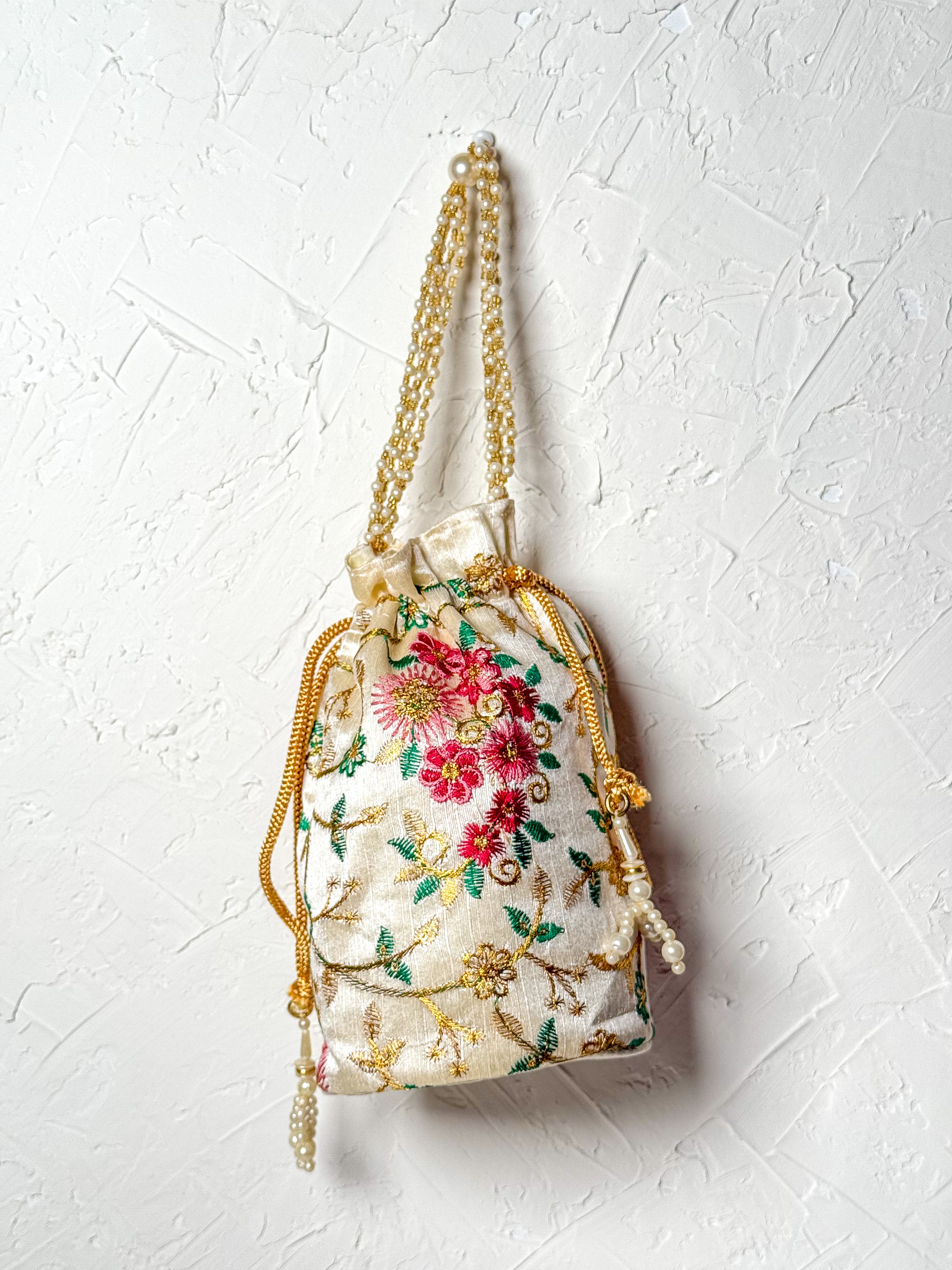 - Elegant Potli Bags with floral patterns and gold thread work.