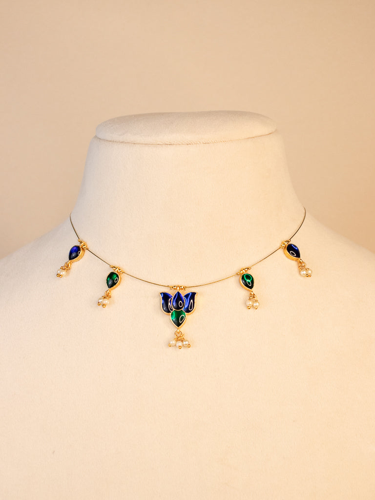 The wire used to string the motifs is strong and cannot be broken by hand, ensuring durability despite its delicate look. The motifs and figurines, like the lotus, parrot, and coin designs, are made with premium materials. While locks and tiny components may naturally tarnish due to individual body conditions, this will not affect the overall elegance, as the pendant remains the centerpiece.