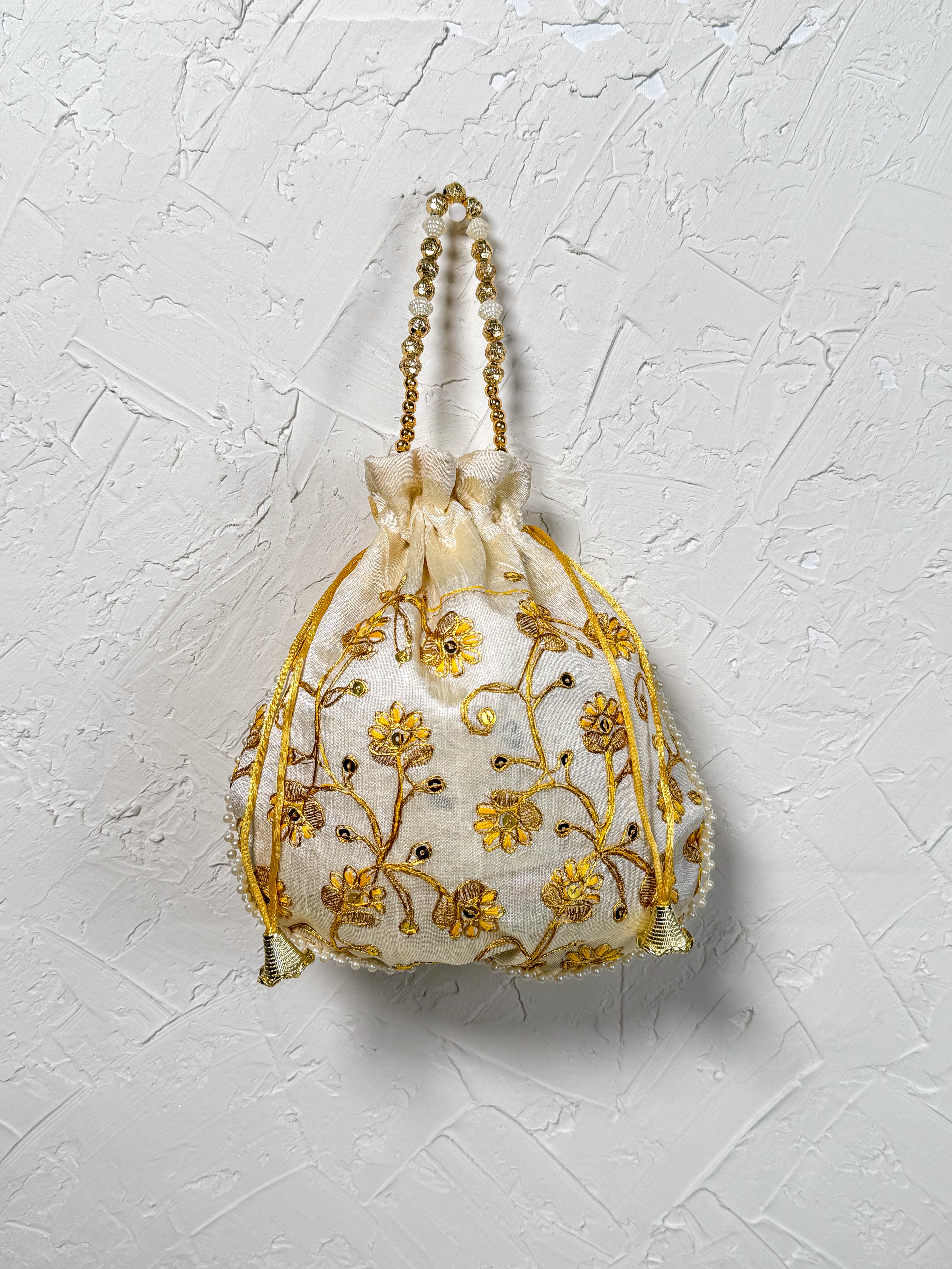 • Elegant Potli Bags with floral patterns and gold thread work.