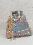 - Elegant Potli Bags with floral patterns and gold thread work.