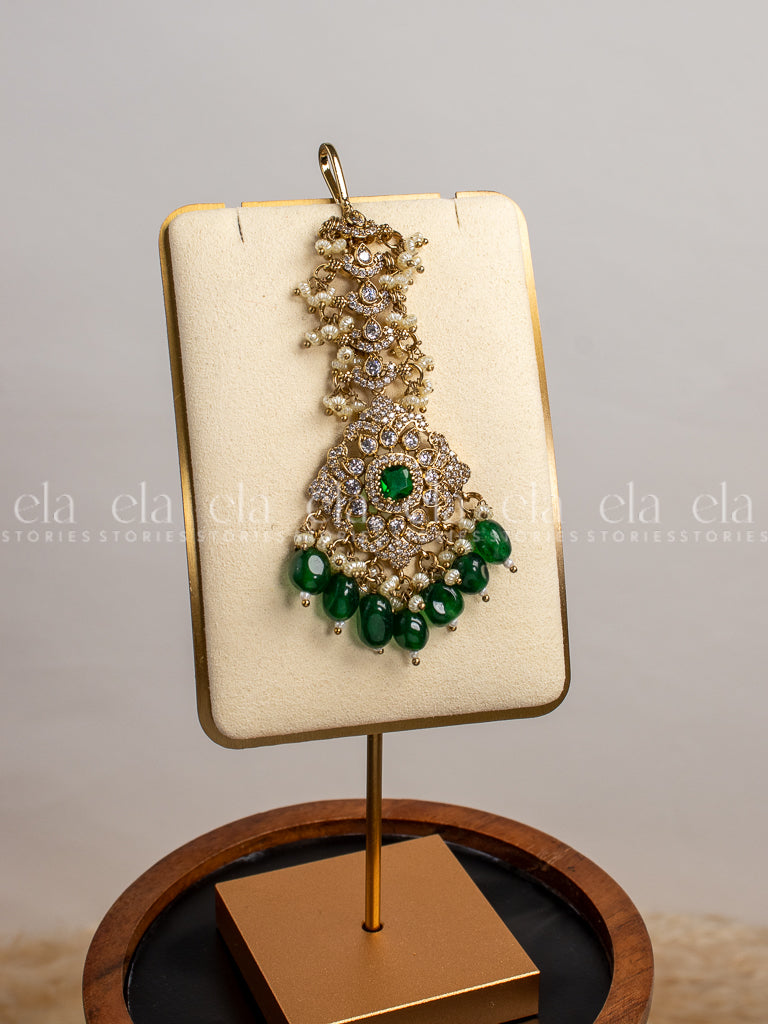 Avec ses détails raffinés, ses pierres étincelantes et sa tenue impeccable, ce Maang Tikka apporte une touche de beauté royale à toutes vos coiffures. Que vous portiez un lehenga, un sari ou une robe, il apportera la touche finale à votre éclat de mariée.