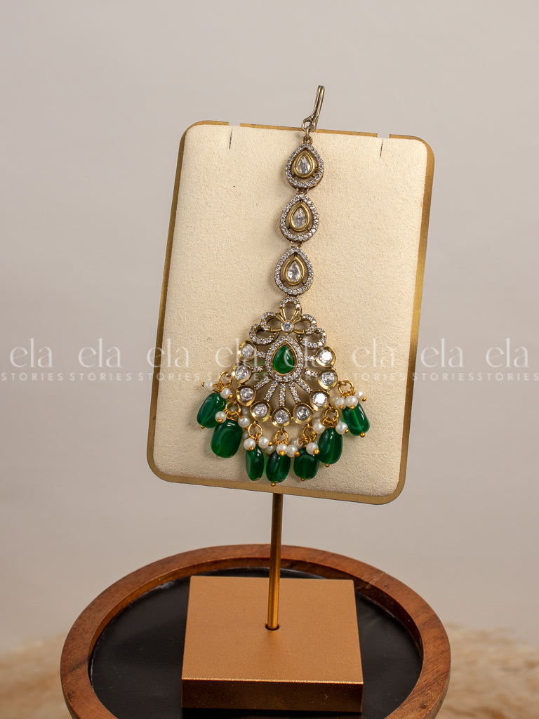 Sublimez votre look de mariée avec notre Maang Tikka, confectionné avec soin. Conçu pour reposer élégamment sur le front, cet accessoire de coiffure allie charme classique et finesse contemporaine, s'accordant parfaitement à votre tenue de mariage.