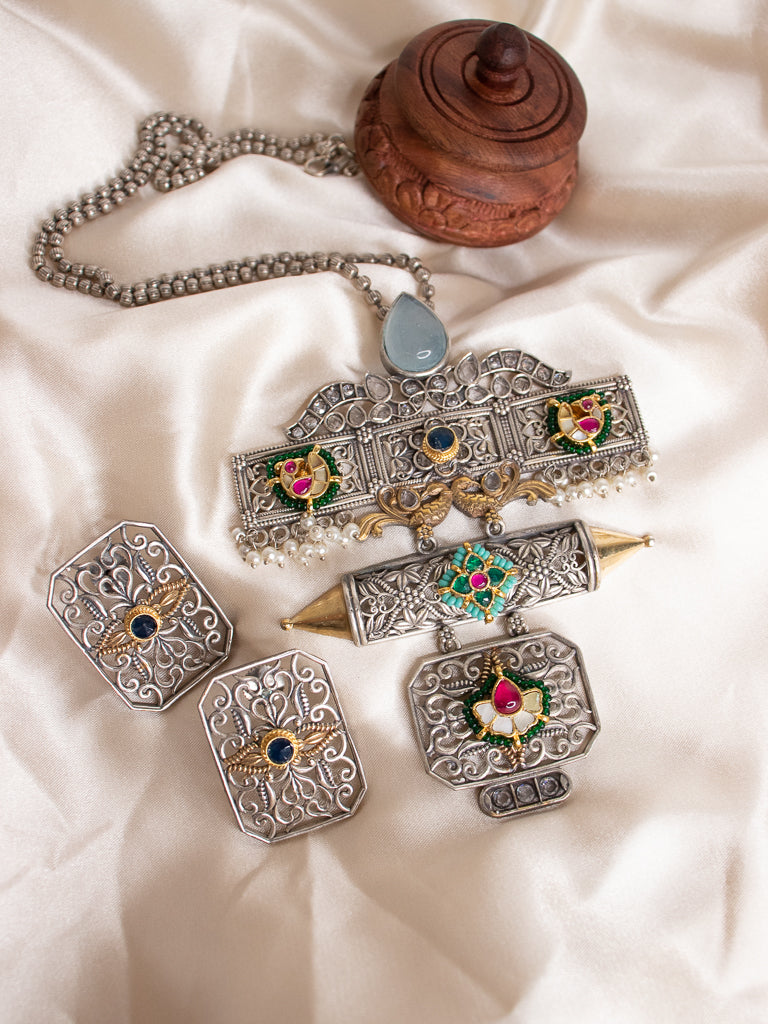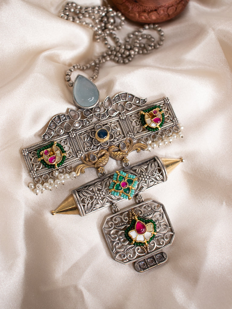 • Fabriqué en laiton de haute qualité avec finition argent allemand. Les motifs sont des pachi kundan en métal cuivré.