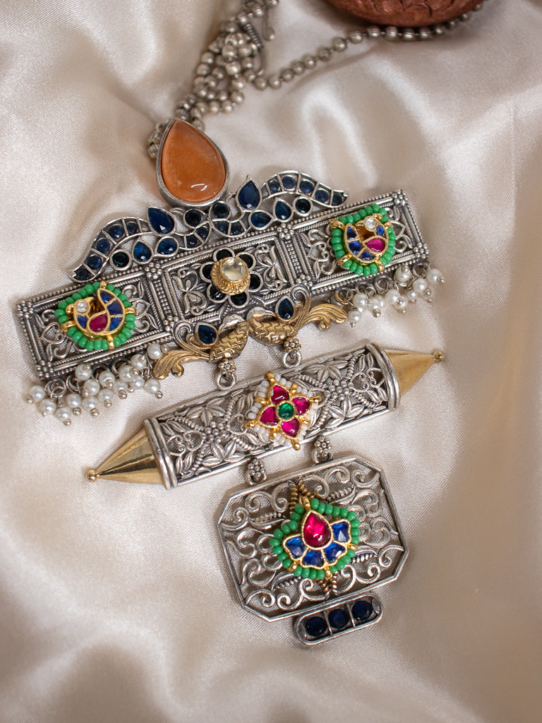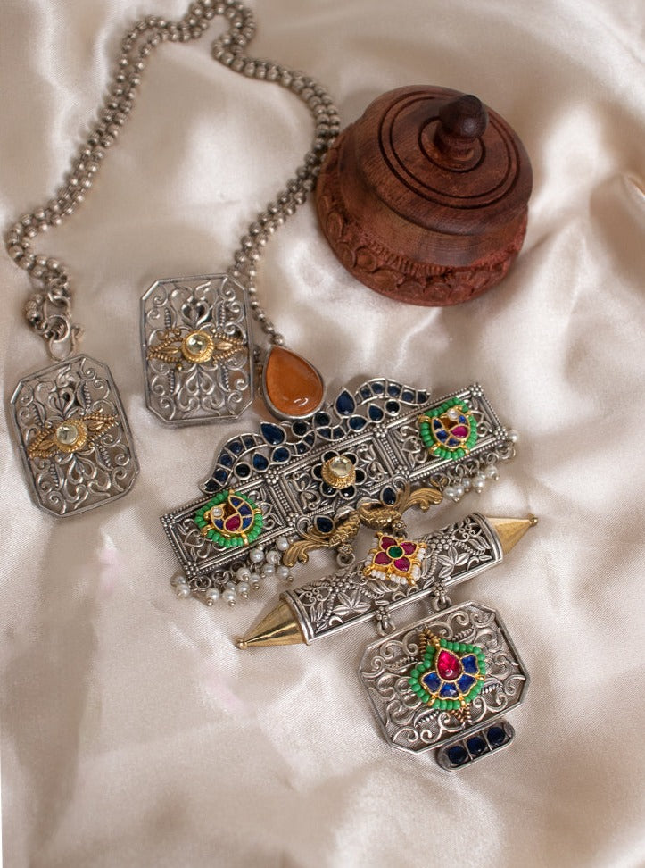 - Fabriqué en laiton de haute qualité avec finition argent allemand. Les motifs sont des pachi kundan en métal cuivré.