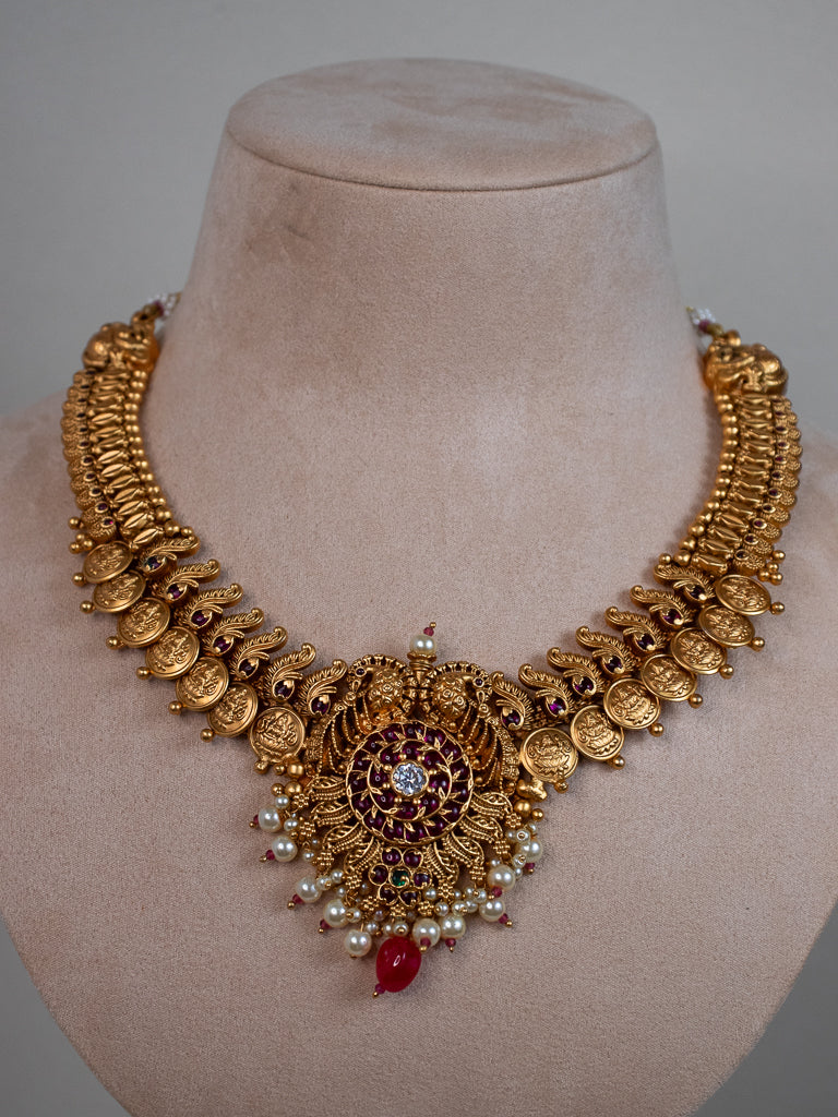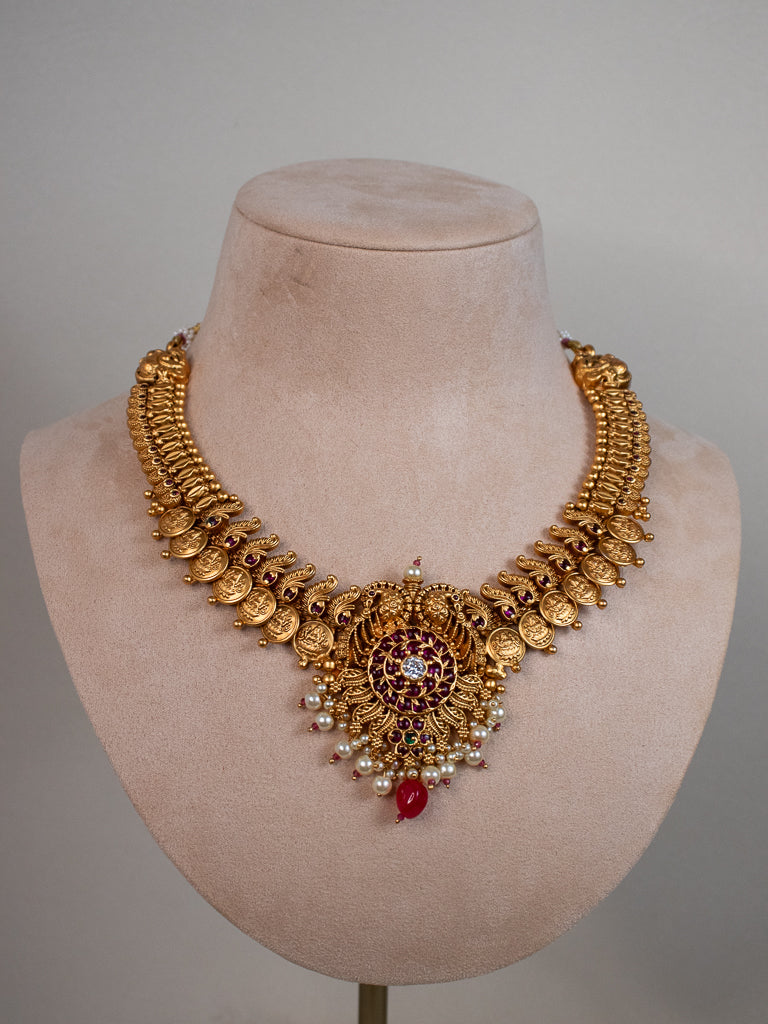 - This Traditional gold look alike Antique Necklace Set includes a short neckpiece with adjustable back rope and a set of beautiful matching earrings.