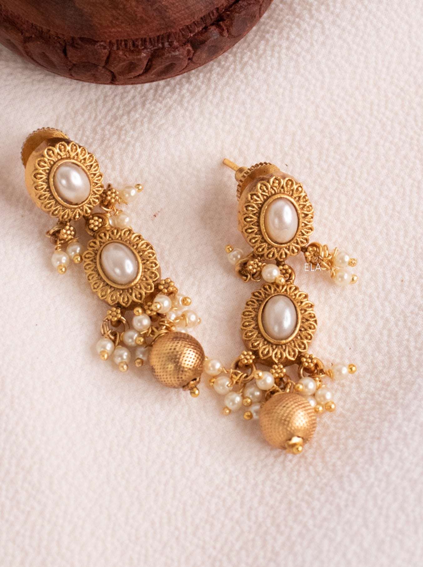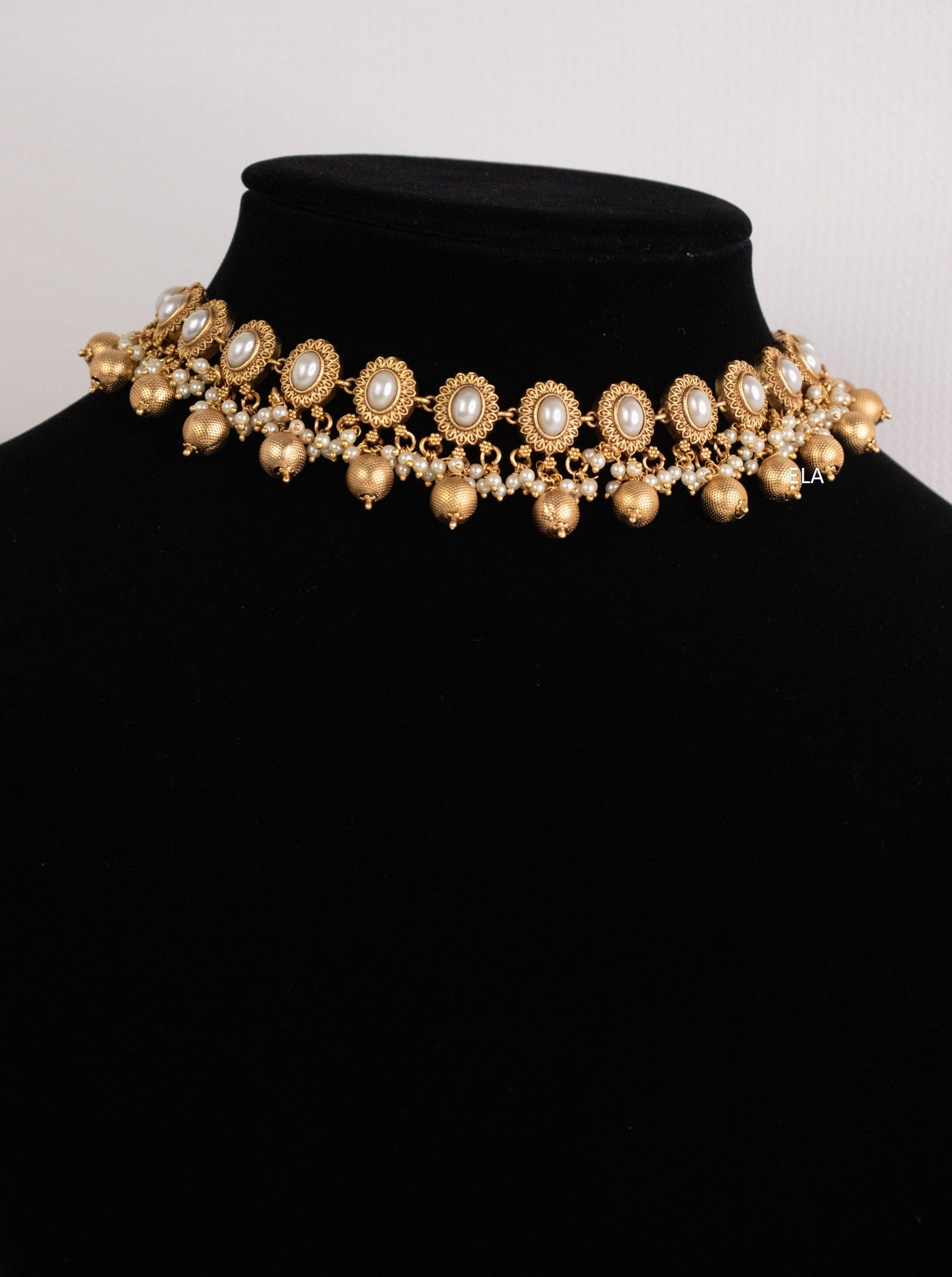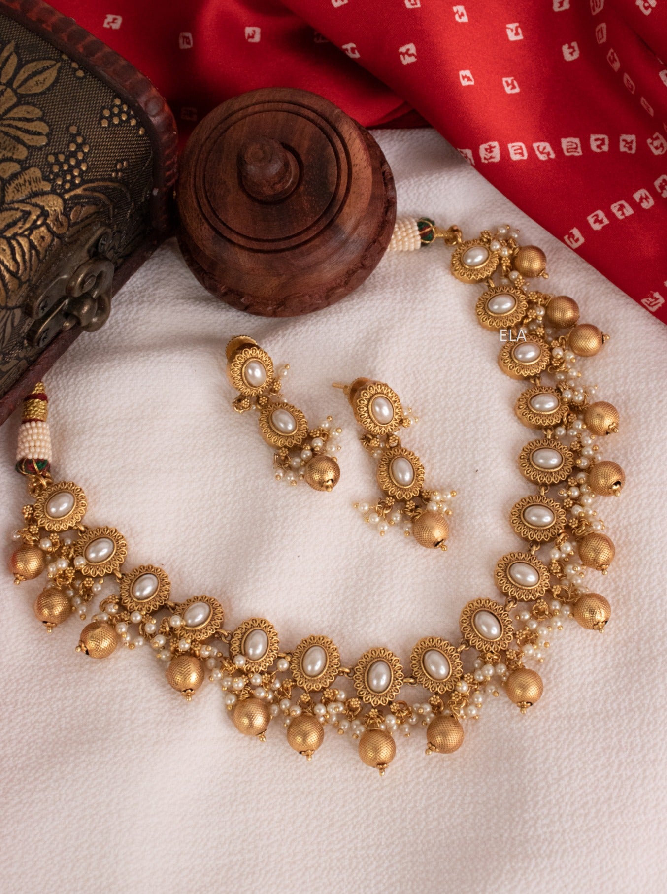 - Consists of a gold look-alike neckpiece, earrings and back rope