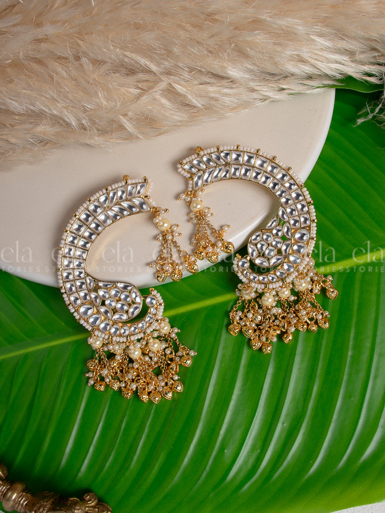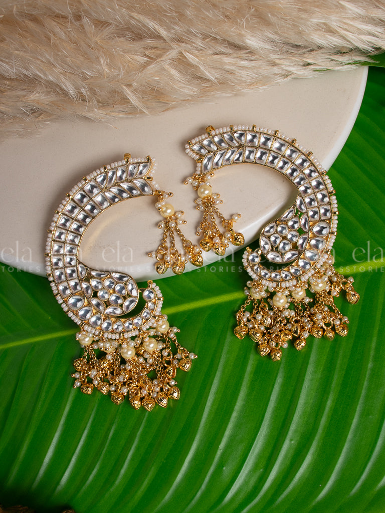 - Measuring at 4 inches in drop and 1.10 inches in width, these earrings are made of brass.