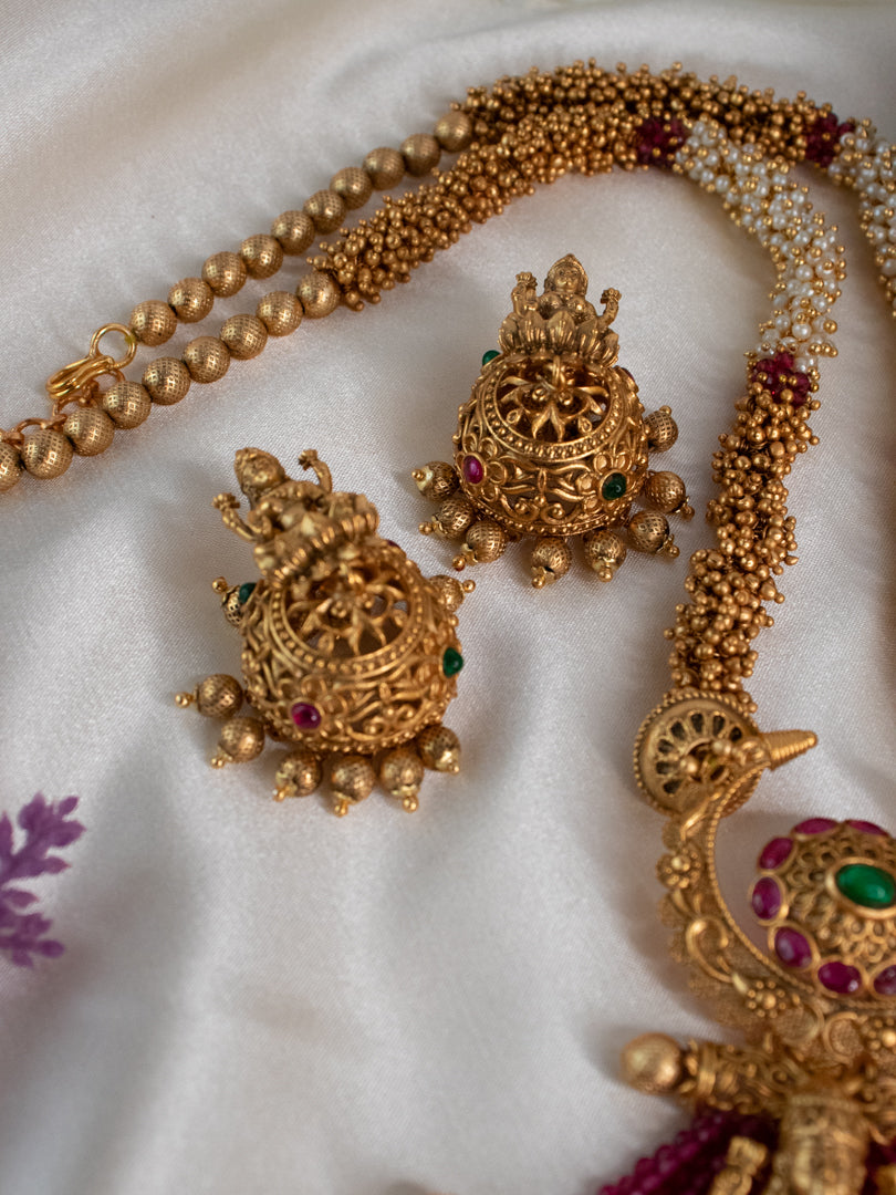 - This unique set includes a necklace and a pair of beautiful jhumkis.