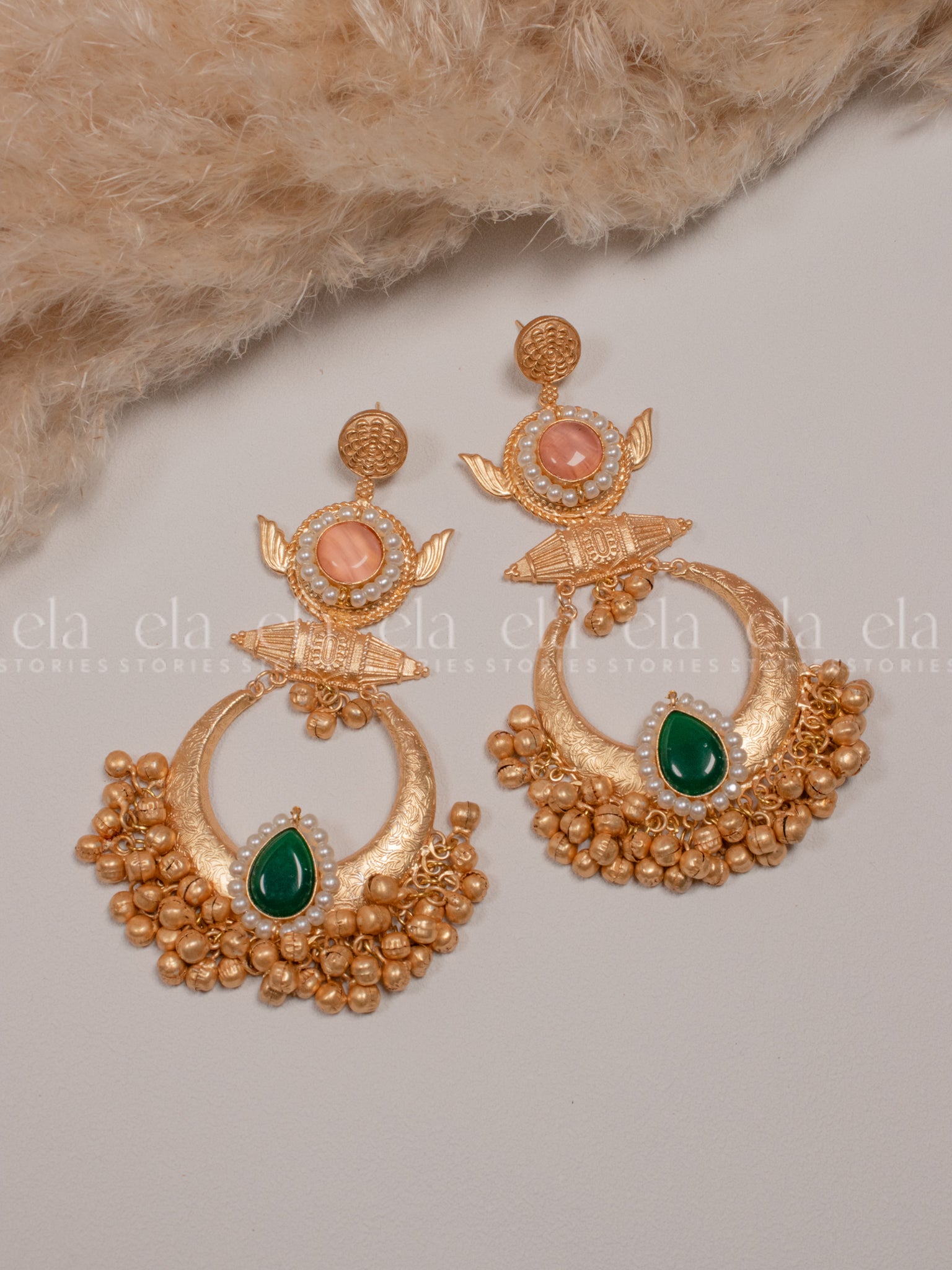Light Weight Gold Tone Ghungroo Statement Earrings - Coral/Green