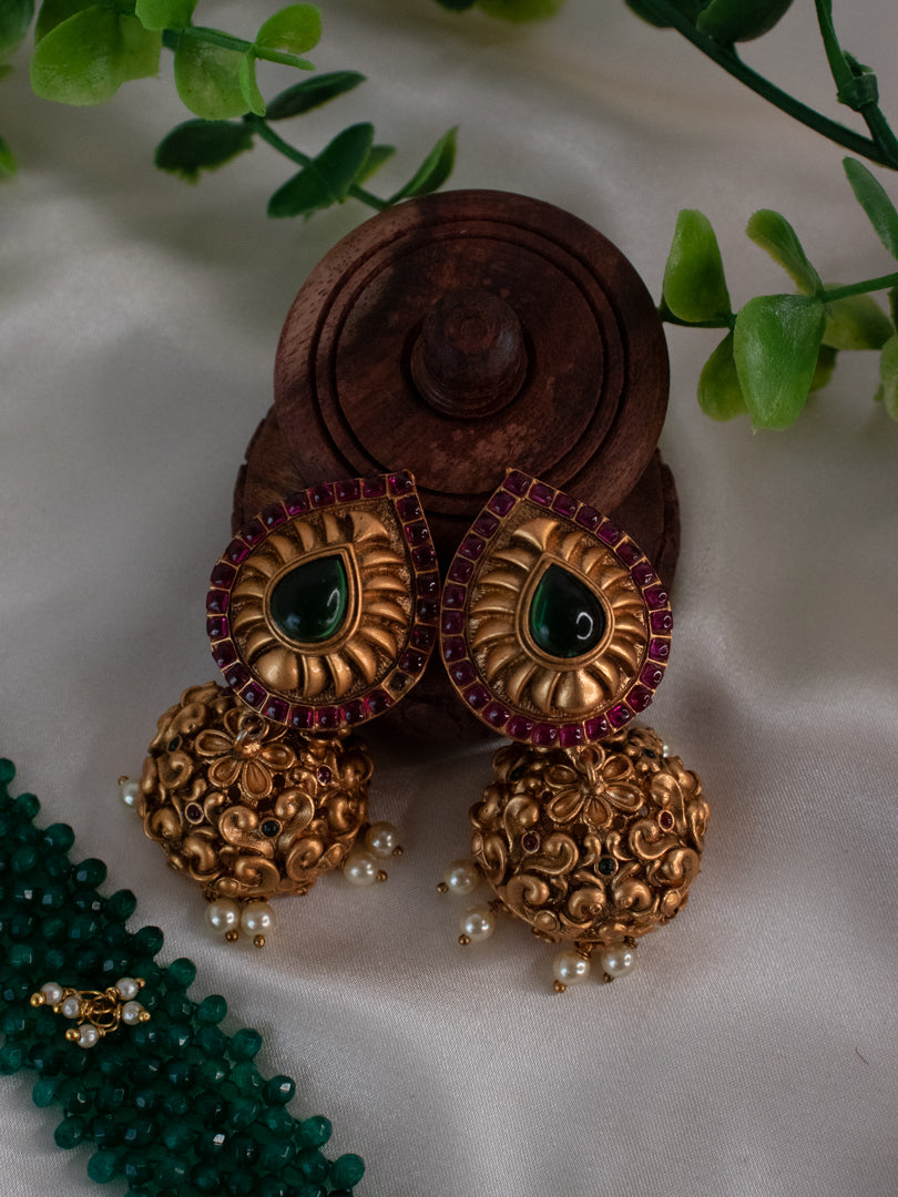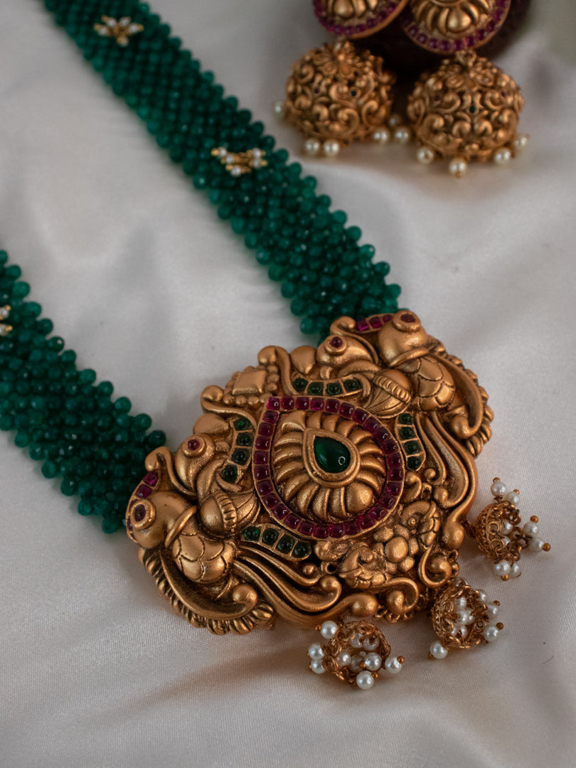 - This unique set includes a long necklace and a pair of beautiful jhumkis.