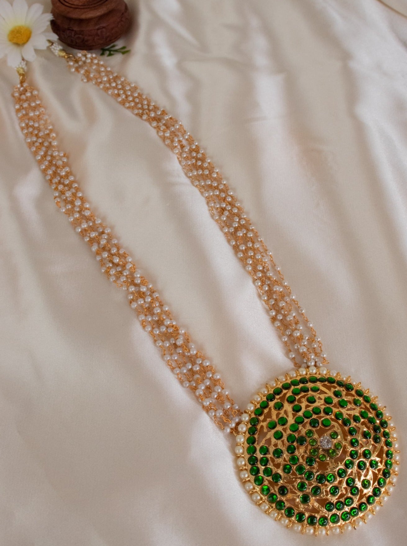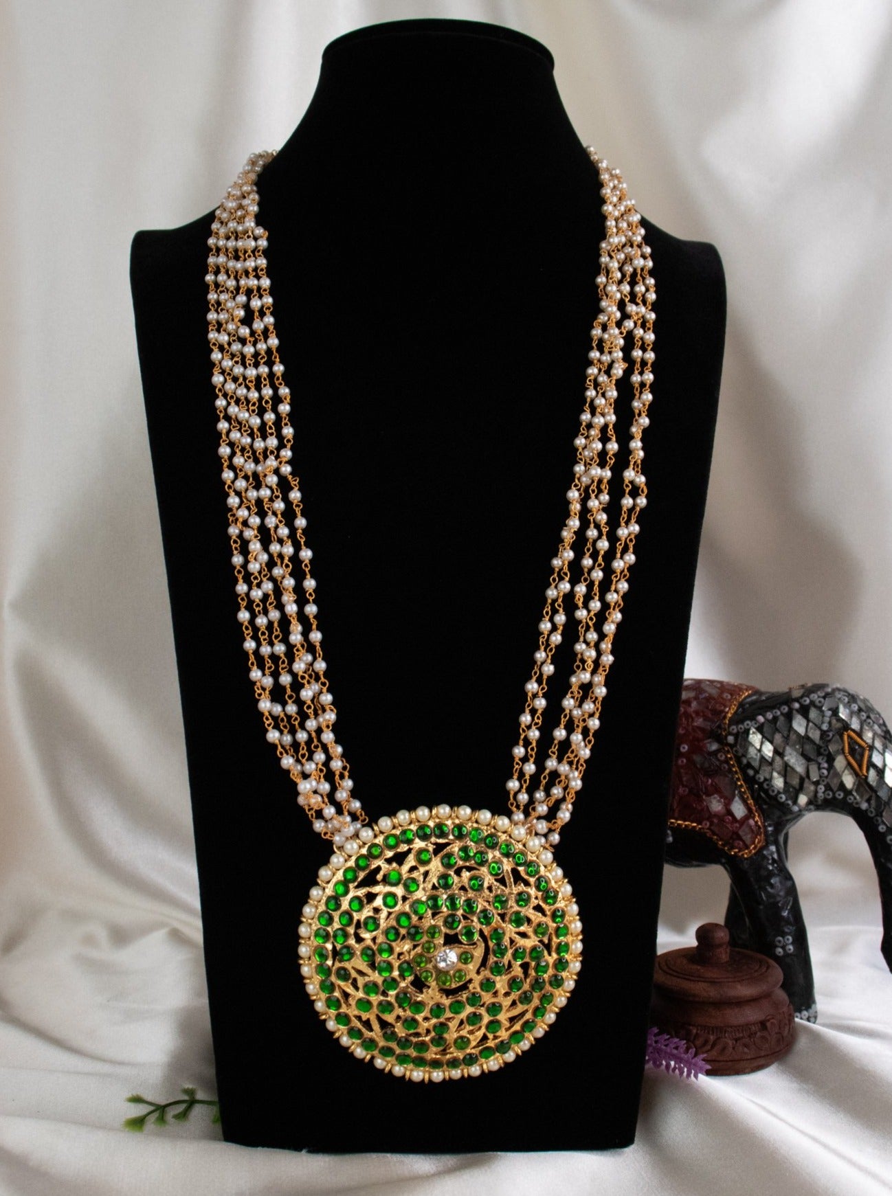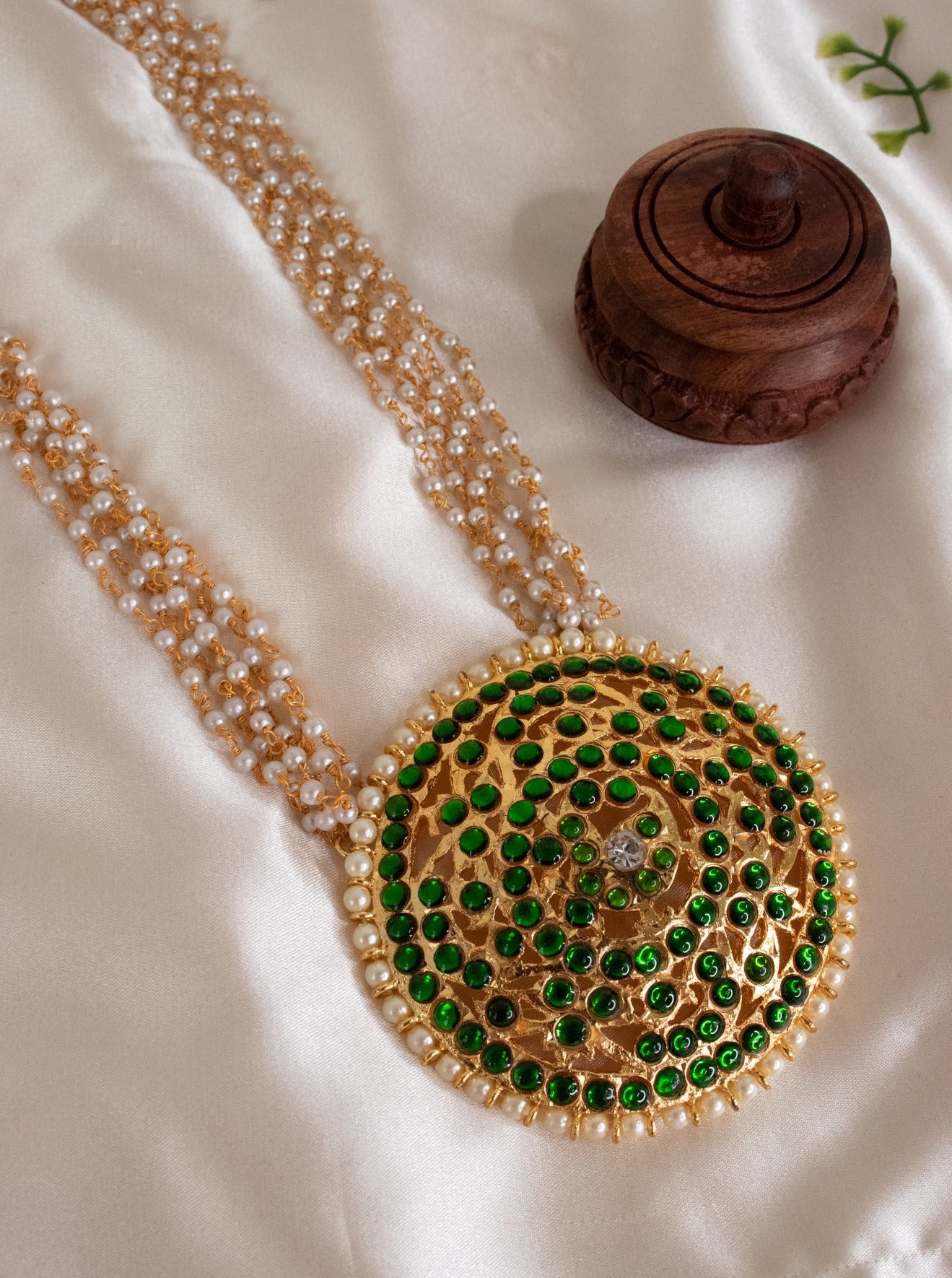 Round Pendant Neckpiece With Long Pearl Chain - Green