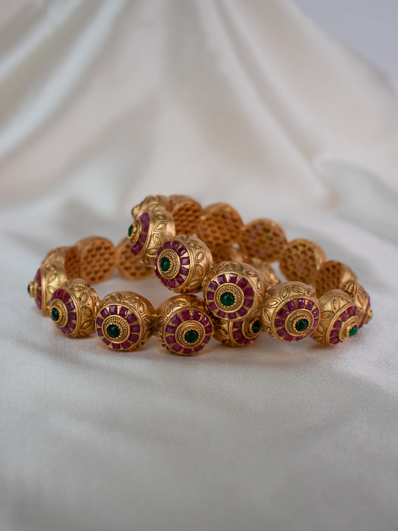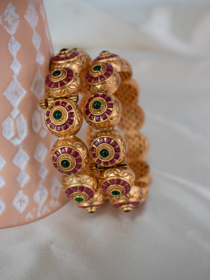 - A Stunning gold bangle with green and red stones. Handcrafted by our artisan in India.
